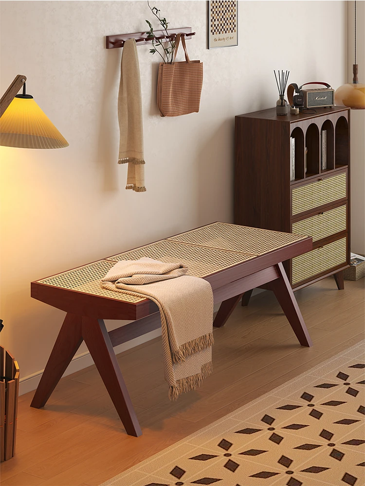 玄関用靴脱ぎベンチ 家庭用 チャンディガールの高級天然木製ラタンベンチ 中古デザインスタイル おしゃれで優雅な雰囲気を演出する高品質ベンチ【限られた空間に最適】