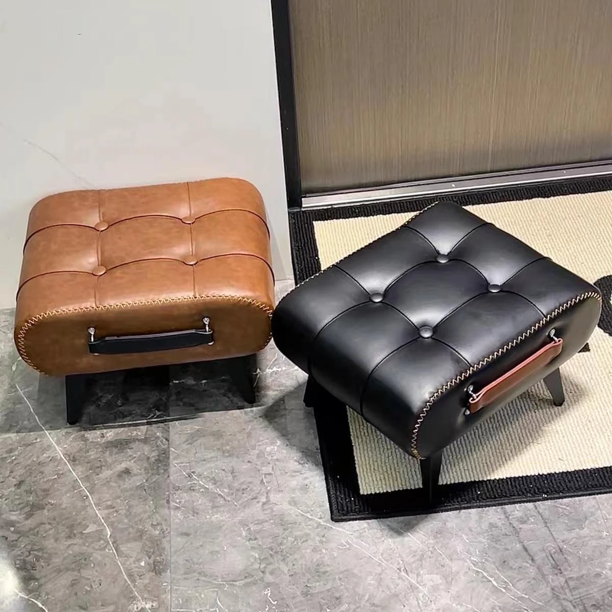 おしゃれなミニスツール|家庭用・リビングにぴったり│ソファの足置きにも最適!玄関での靴の脱ぎ履きも楽々♪ 高級感漂うソフトパッケージレザー製のスツールで、快適な空間を演出!
