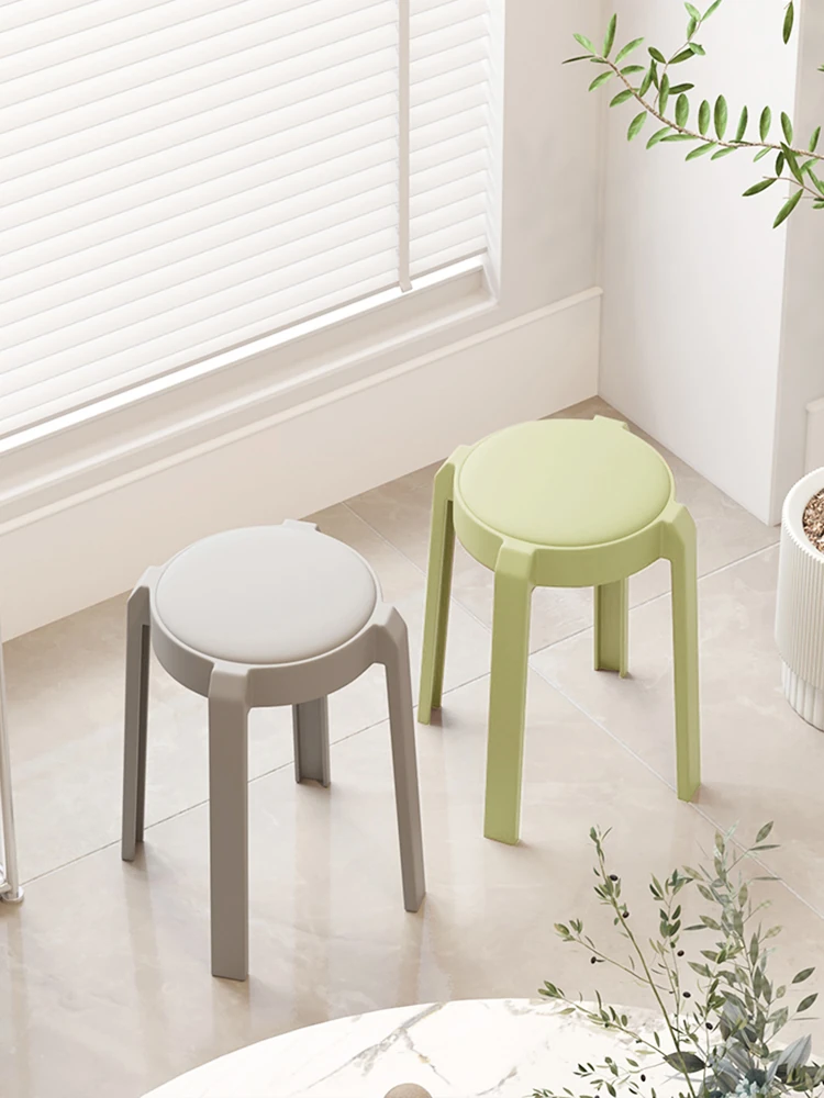 厚手のプラスチック製スツール - 家庭用食卓やダイニングに最適!クッション付きで座り心地抜群、スタイリッシュな円形デザイン。積み重ね可能で、省スペースにも便利なモダンなハイスツール!